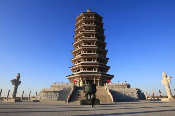 宝塔塔身通高81米,冬天遍地是雪的时候看着挺仙儿的,适合拍照留念。广场设计为太极圆形图案,直径171米,广场及环场道路占地面积3.1万平方米。广场两个极点分别布设龟和麒麟;广场布设56根青石盘龙浮雕柱,寓意为中华56个民族。主广场为两层错台,高4米,广场侧墙环绕以护城河意象的水池,外部再围以环形道路,并在东西南北四个方向拓宽设置巨大的鼎雕塑和擎天精雕龙柱。