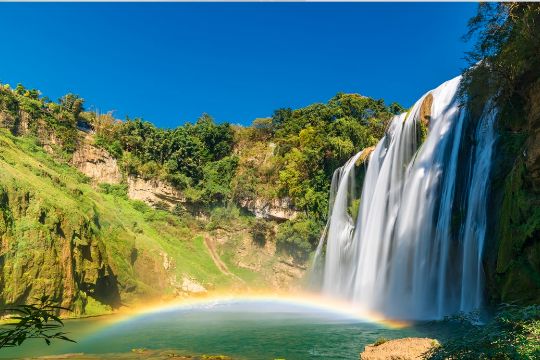 黄果树瀑布是贵州省黔南布依族苗族自治州的重要景点。这一独特景观被雨林和山茶树所包围。从高处俯瞰,瀑布上空飞溅的水滴组成了如白雾般的云层,营造出如梦如幻的景象。这里的植物相当丰富,所以适合植物爱好者来此寻找珍稀的植物品种。