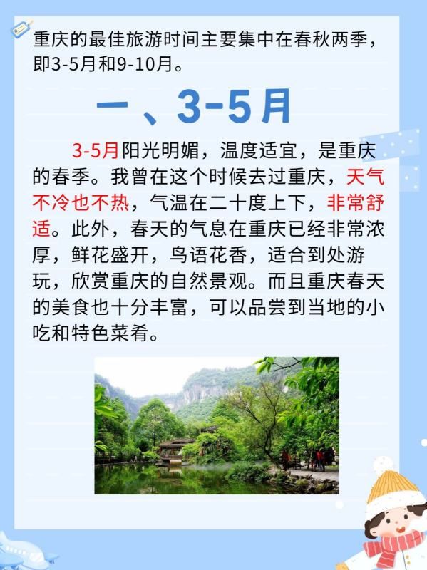 去重庆旅游最佳的时间主要是春秋两季,也就是3到5月和9到10月。春季的3到5月,阳光正好,气候适宜,这时候的重庆不冷不热,气温在二十度左右,让人感觉很舒适。春天里的重庆,花香鸟语,满城鲜花,非常适合出去游玩,欣赏大自然的美景。而且,春天的美食也特别丰富,可以品尝到各种当地小吃和特色菜。