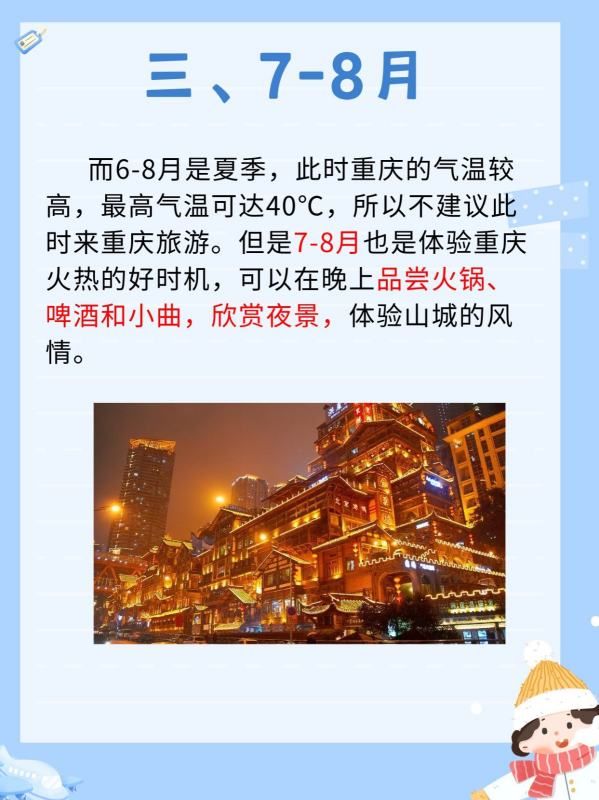 至于夏季的6到8月,重庆的气温较高,最高可达40℃,所以不太建议这时候来旅游。但是,7到8月是体验重庆火热氛围的好时机,晚上可以品尝火锅、喝啤酒,听听小曲,欣赏夜景,感受山城的风情。