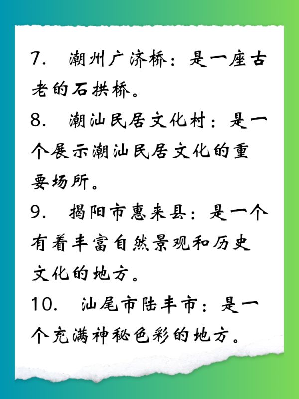 9. 揭阳市惠来县:这个地方是一个有着丰富自然景观和历史文化的地方。这里有著名的乌石村和万安桥等景点,还有许多美食和文化可以品尝。