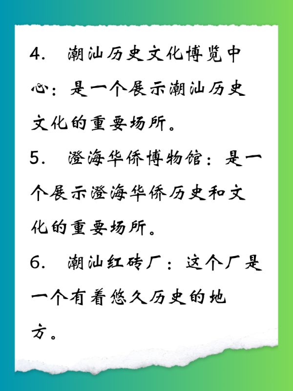 5. 澄海华侨博物馆:这个博物馆是一个展示澄海华侨历史和文化的重要场所。在这里可以了解到澄海华侨的历史和现状,还可以看到许多珍贵的文物和文化遗产。