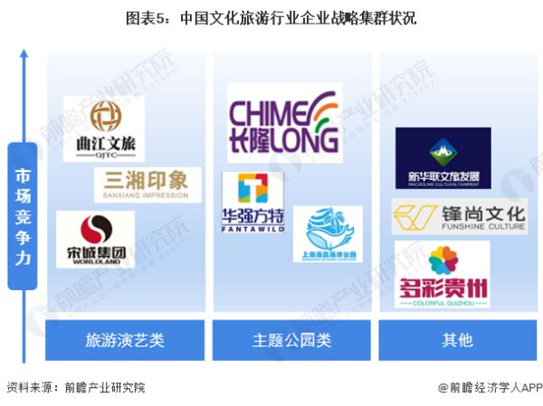 从我国文化旅游行业企业战略集群来看,根据文旅子行业的不同,可大致分为旅游演艺类、主题公园类等。市场竞争力可以从企业营收规模、产品品牌力的角度进行分析,其中曲江文旅、长隆集团作为规模较大的企业有着较为明显的竞争优势。