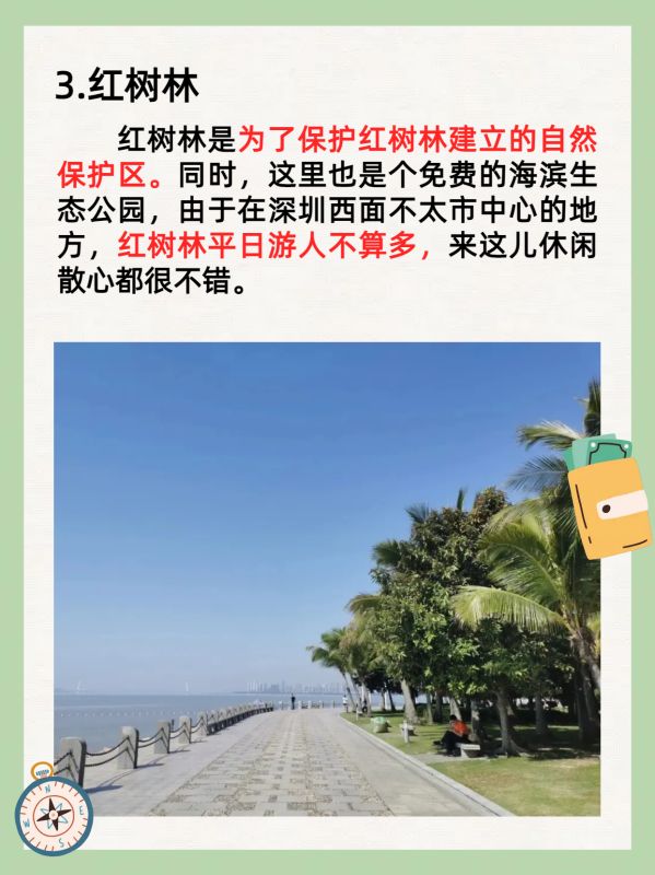 红树林是为了保护红树林建立的自然保护区。同时,这里也是个免费的海滨生态公园,由于在深圳西面不太市中心的地方,红树林平日游人不算多,来这儿休闲散心都很不错。