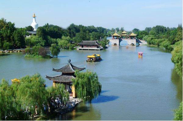 扬州市西北部的瘦西湖,窈窕曲折的湖道,串以长堤春柳、四桥烟雨、徐园、小金山、吹台、五亭桥、白塔、二十四桥、玲珑花界、熙春台、望春楼、吟月茶楼、湖滨长廊、石壁流淙、静香书屋等两岸景点,俨然一幅天然秀美的国画长卷。