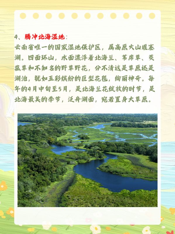 云南省唯一的国家湿地保护区,属高原火山堰塞湖。每年的4月中旬至5月,是北海兰花绽放的时节,也是北海最美的季节,泛舟湖面,宛若置身在大草原。