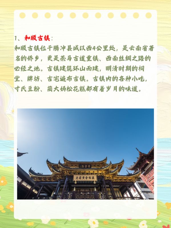 腾冲的旅游景点有:热海风景区、火山地热公园、和顺古镇、北海湿地、东山草场、固东银杏村等。