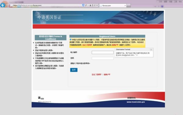 第二步:前往申请美国签证网进行申请,网址:https://cgifederal.secure.force.com 。注意:没有账号,请创建新的用户账号登陆。