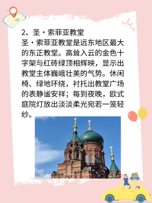 圣·索菲亚教堂是远东地区最大的东正教堂。高耸入云的金色十字架与红砖绿顶相辉映,显示出教堂主体巍峨壮美的气势。休闲椅、绿地环绕,衬托出教堂广场的表静谧安祥;每到夜晚,欧式庭院灯放出淡淡柔光宛若一笼轻纱。
