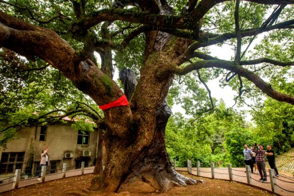 在四面环水的赤山岛上,有一棵奇特的樟抱腊树。古老樟树的枝体上,长着一棵青翠的腊树,两棵树早已连成一体,相亲相爱的拥抱在一起,挺立在南咀镇的芭蕉村头。腊,树高19米,胸围9.9米,要6个人才能合围,树冠宽15米。抱在怀中的腊树,单高10米,胸围1.26米。