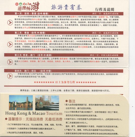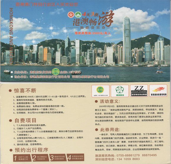 上面标注:送香港手机卡80元(含80元话费)、香港充电转换插座,香港用英式电源、送香港地图没人1张、免费接机/接站,免费送四星级酒店住宿一晚等;自费:个人所在地至深圳往返交通费、行程外个人所产生的费用、个人证件相关费用、全程导游和司机小费170元/人,口岸服务费50元/人(港澳),全程220元,出团前付清、国内段交通住宿费用。活动适用于26-59岁,身体健康完全民事责任的中国公民。不在此年龄不占床位需加收500人/人,占床加收1000元/人。第二次进港加收500元/人。活动日期为2013年1月1日至2014年12月31日。
