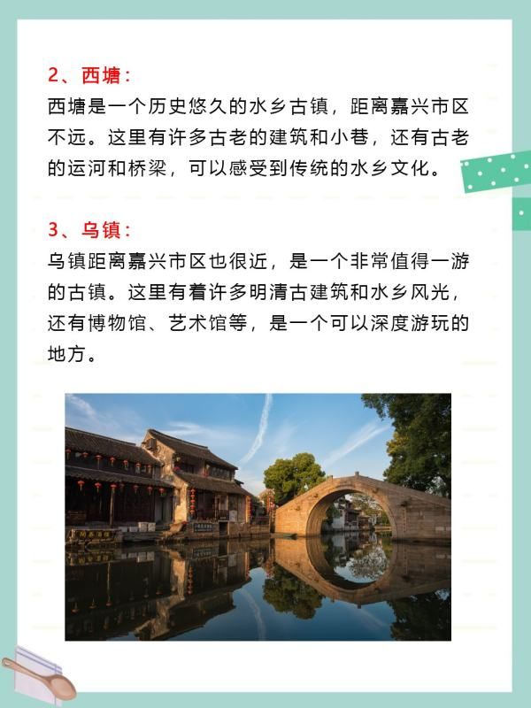 乌镇距离嘉兴市区也很近,是一个非常值得一游的古镇。这里有着许多明清古建筑和水乡风光,还有博物馆、艺术馆等,是一个可以深度游玩的地方。