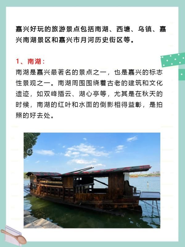 嘉兴好玩的旅游景点包括南湖、西塘、乌镇、嘉兴南湖景区和嘉兴市月河历史街区等。