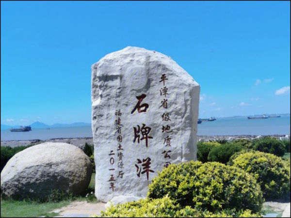 在平潭岛西北端苏澳镇西侧的海面上有一块圆盘形大礁石,它托着一高一低的两根碑形海蚀柱,整体看起来就像一艘大帆船。两块巨石像两面鼓起的风帆,船似乎正在乘风破浪前进。这是平潭知名的石牌洋自然景观。