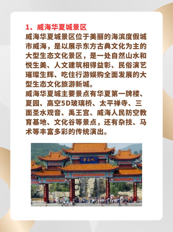 1、威海华夏城景区 :威海华夏城景区是一处自然山水和悦生美、人文建筑相得益彰、民俗演艺璀璨生辉全面发展的大型生态文化旅游新城。
