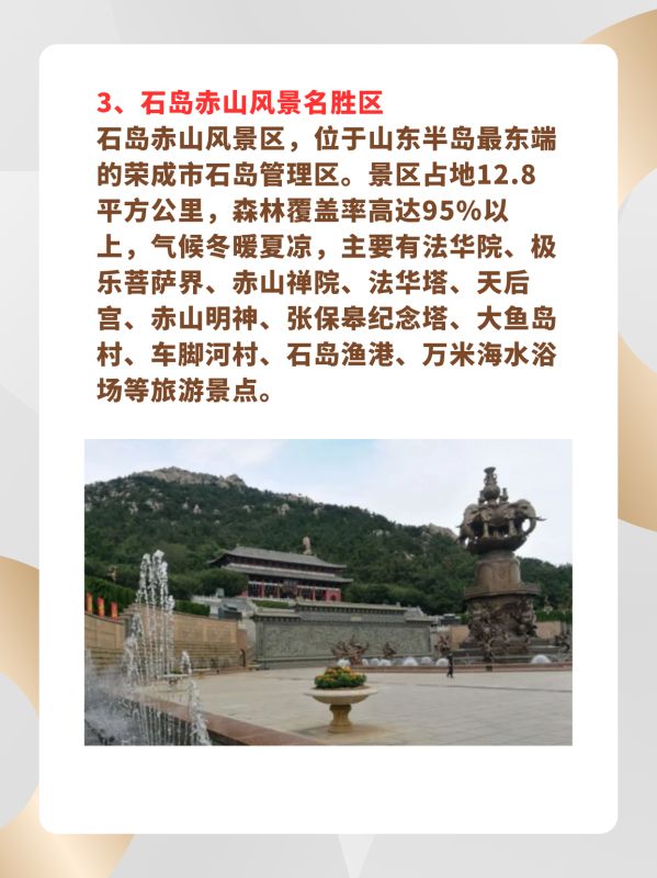 3、石岛赤山风景名胜区:石岛赤山风景区,位于山东半岛最东端的荣成市石岛管理区。景区占地12.8平方公里,森林覆盖率高达95%以上,气候冬暖夏凉。