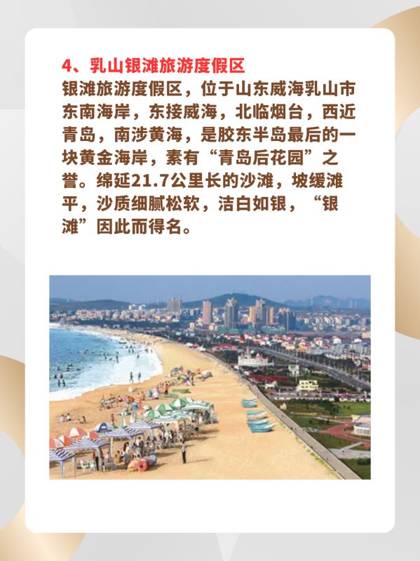 4、乳山银滩旅游度假区:银滩旅游度假区绵延21.7公里长的沙滩,坡缓滩平,沙质细腻松软,洁白如银,“银滩”因此而得名。