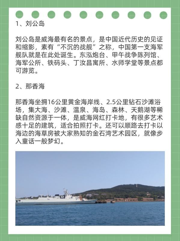 - 第一天:抵达威海,参观威海市中心的景点,如威海公园、威海博物馆等。