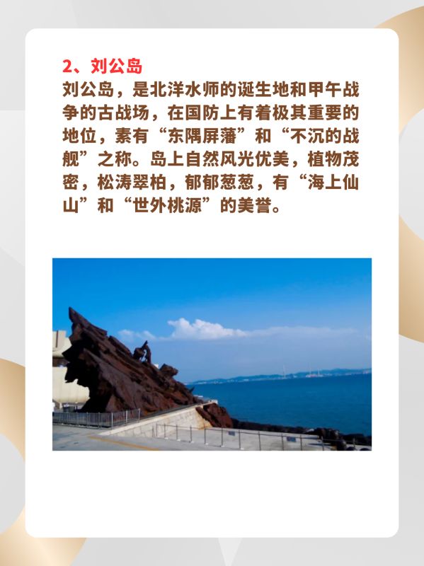 2、刘公岛:岛上自然风光优美,植物茂密,松涛翠柏,郁郁葱葱,有“海上仙山”和“世外桃源”的美誉。