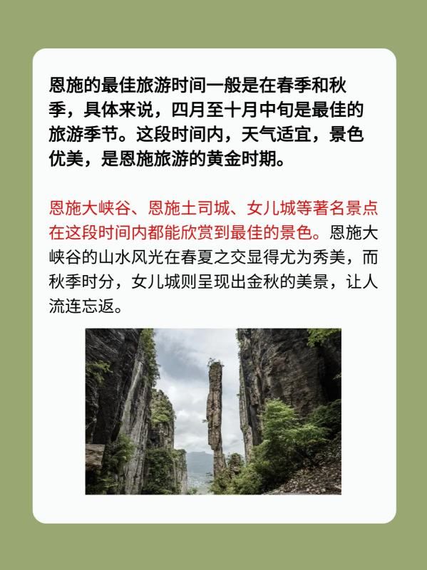 恩施的最佳旅游时间一般是在春季和秋季,具体来说,四月至十月中旬是最佳的旅游季节。这段时间内,天气适宜,景色优美,是恩施旅游的黄金时期。