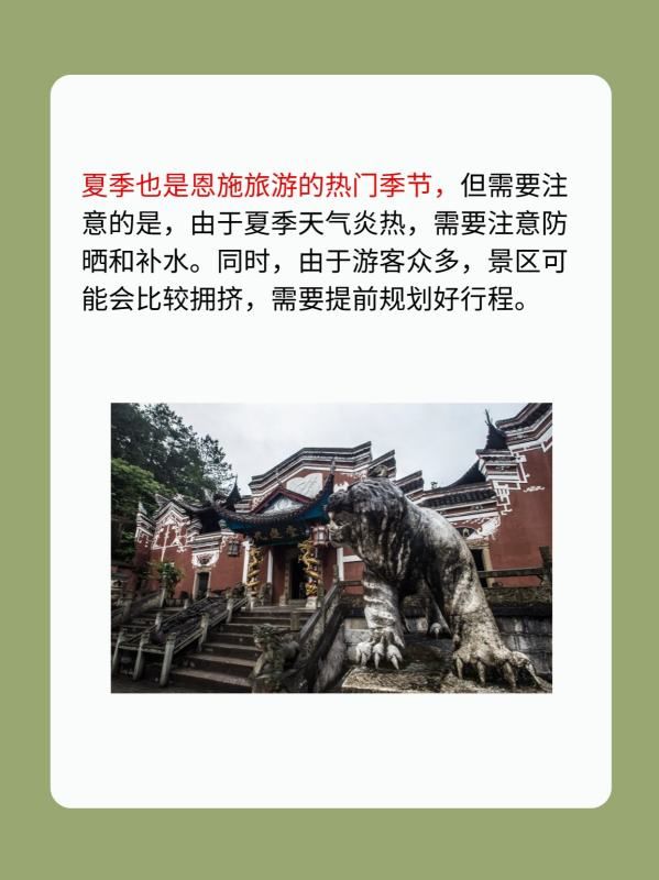 夏季也是恩施旅游的热门季节,但需要注意的是,由于夏季天气炎热,需要注意防晒和补水。同时,由于游客众多,景区可能会比较拥挤,需要提前规划好行程。