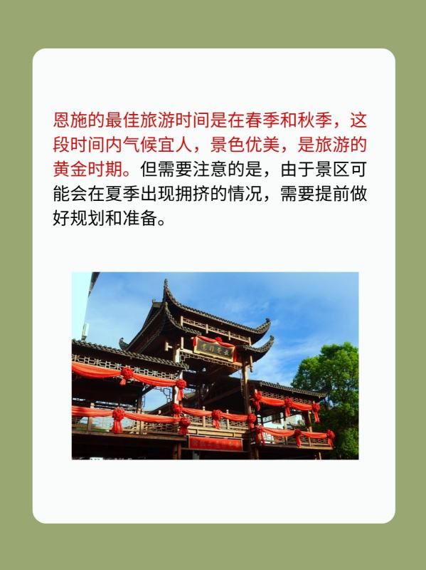 恩施的最佳旅游时间是在春季和秋季,这段时间内气候宜人,景色优美,是旅游的黄金时期。但需要注意的是,由于景区可能会在夏季出现拥挤的情况,需要提前做好规划和准备。