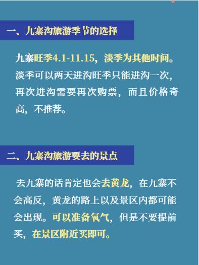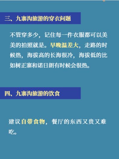 1、九寨沟地处高海拔地区,注意预防高原反应。如有需要,可提前准备好氧气袋。