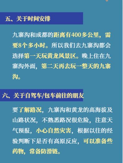 要了解路况,九寨沟和黄龙的高海拔及山路状况,不熟悉路况很危险,注意天气预报,小心自然灾害,根据以往的经验判断下是否有高原反应,如果有或者不知道就准备些药物,如红景天,携氧片一类的,常备防滑链。