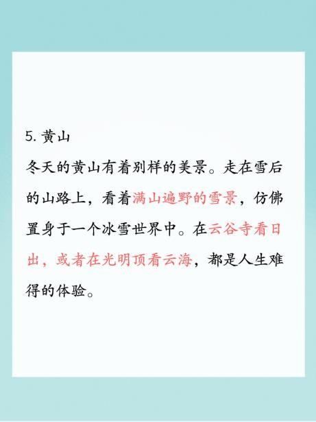 5. 黄山:冬天的黄山有着别样的美景。走在雪后的山路上,看着满山遍野的雪景,仿佛置身于一个冰雪世界中。在云谷寺看日出,或者在光明顶看云海,都是人生难得的体验。
