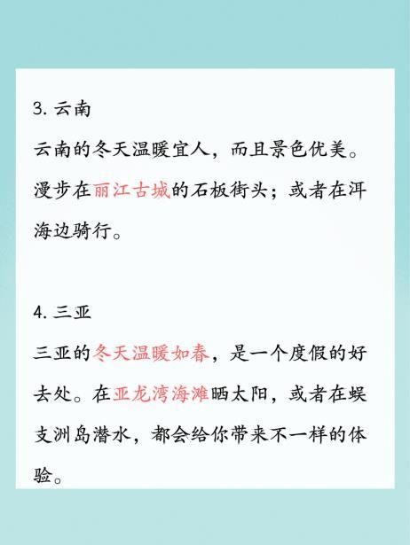 3. 云南:云南的冬天温暖宜人,而且景色优美。漫步在丽江古城的石板街头,感受着浓厚的历史气息;或者在洱海边骑行,欣赏着湖光山色,你会觉得生活如此美好。