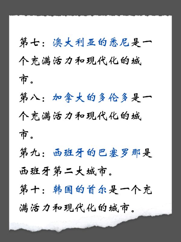 第七名是澳大利亚的悉尼。悉尼是一个充满活力和现代化的城市,有着许多著名的景点,比如悉尼歌剧院、海港大桥和邦迪海滩。如果你喜欢海滩和阳光,悉尼绝对是一个不错的选择。