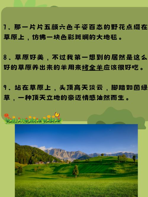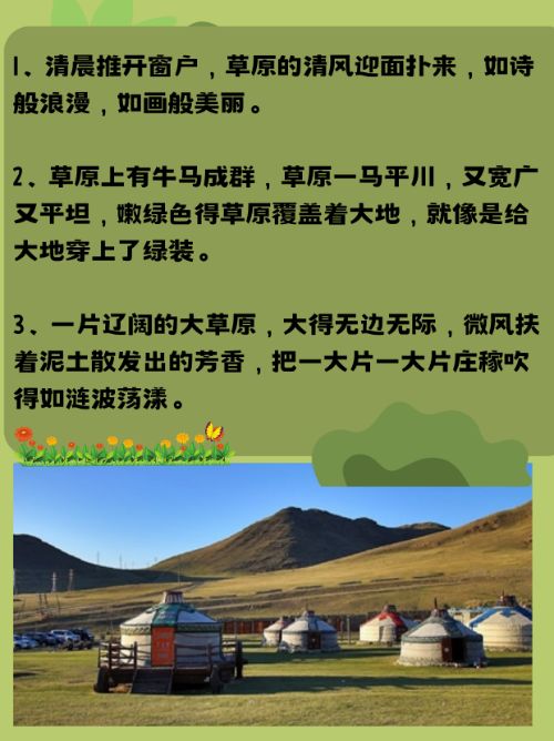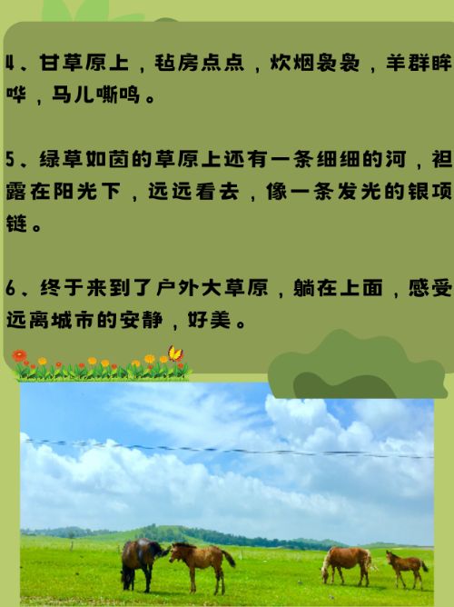 2、草原上有牛马成群,草原一马平川,又宽广又平坦,嫩绿色得草原覆盖着大地,就像是给大地穿上了绿装。