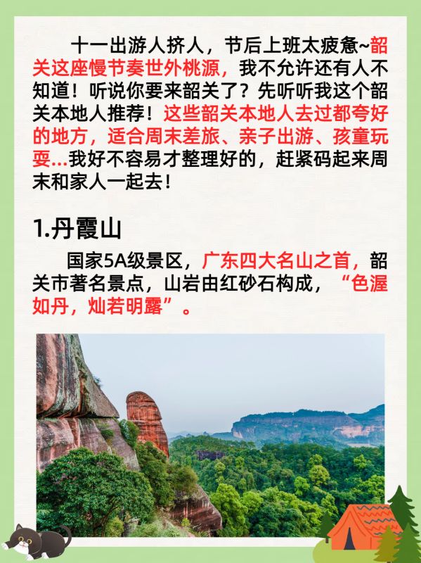 十一出游人挤人,节后上班太疲惫~韶关这座慢节奏世外桃源,我不允许还有人不知道!听说你要来韶关了?先听听韶关本地人推荐!这些韶关本地人去过都夸好的地方,适合周末差旅、亲子出游、孩童玩耍...我好不容易才整理好的,赶紧码起来周末和家人一起去!