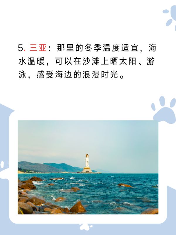 5. 三亚:如果你喜欢温暖的气候,那么三亚是一个不错的选择。那里的冬季温度适宜,海水温暖,你可以在沙滩上晒太阳、游泳,感受海边的浪漫时光。