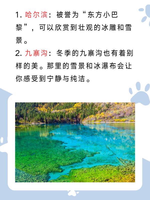 2. 九寨沟:尽管大部分人都选择在秋季去九寨沟,但其实冬季的九寨沟也有着别样的美。那里的雪景和冰瀑布会让你感受到宁静与纯洁。