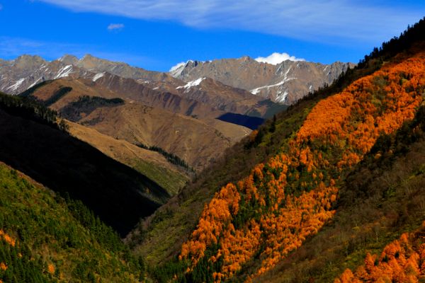 位于小金县东部,距成都市200余公里。四姑娘山主峰四川仅次于贡嘎山的第二高峰,四姑娘、三姑娘、二姑娘、大姑娘海拔分别为6250米、5664米、5454米、5355米。因这里的雪峰、森林、牧场、河流、藏家组成的独特景观颇具异域风情,故而有"东方的阿尔卑斯山"之称。