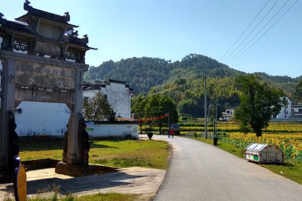 蜀源的秋天,金黄色的向日葵成片地盛开,石板路、民宅、祠堂、牌坊都被它们映衬出一片勃勃生机。