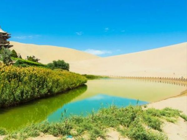鸣沙山月牙泉:鸣沙山是中国四大沙漠之一的巴丹吉林沙漠的一部分,以其独特的沙漠景观而闻名。月牙泉是鸣沙山脚下的一处湖泊,形状酷似一弯新月,被誉为“沙漠明珠”。