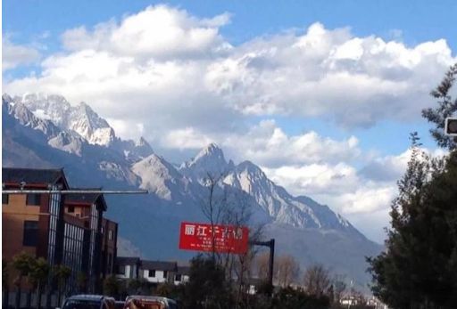 站在束河古镇的大石桥上,就能看到玉龙雪山。玉龙雪山海拔5596米,以险、奇、美、秀著称。山上景色随着时令和阴晴的变化,有时云蒸霞蔚,玉龙时隐时现;有时碧空如水,群峰晶莹耀眼;有时云带束腰,云中雪峰皎洁,云下岗峦碧翠;有时霞光辉映,雪峰如披红纱,娇艳无比。