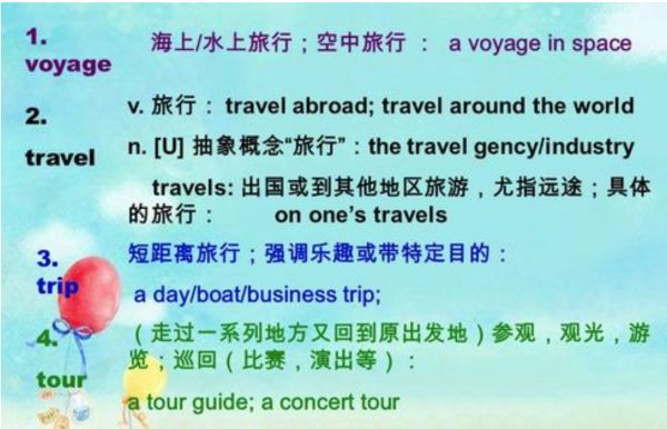 5、travel作“旅行、游历”解,一般表示从一地到另一地旅行这一总的概念。常指长时间、远距离的“旅行”。尤指出国旅行。可作动词和名词。其复数形式意思为“旅游笔记”、“游记”。例如: