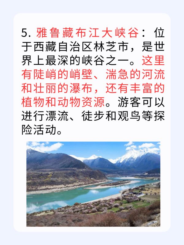 5. 雅鲁藏布江大峡谷:位于西藏自治区林芝市,是世界上最深的峡谷之一。这里有陡峭的峭壁、湍急的河流和壮丽的瀑布,还有丰富的植物和动物资源。
