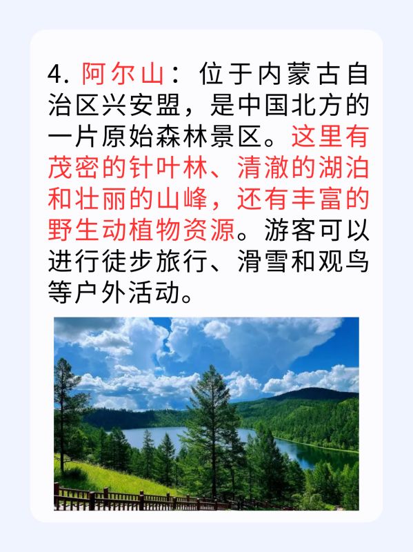 4. 阿尔山:位于内蒙古自治区兴安盟,是中国北方的一片原始森林景区。