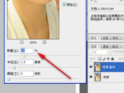 4.然后复制背景复制层,选择滤镜,锐化,USM锐化,设置数量为40%,设置半径为1.5像素,设置阈值为0色阶。知道单击ok。