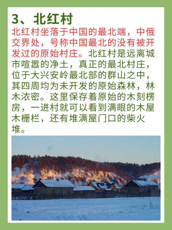 北红村坐落于中国的最北端,中俄交界处,号称中国最北的没有被开发过的原始村庄。北红村是远离城市喧嚣的净土,真正的最北村庄,位于大兴安岭最北部的群山之中,其四周均为未开发的原始森林,林木浓密。这里保存着原始的木刻楞房,一进村就可以看到满眼的木屋木栅栏,还有堆满屋门口的柴火堆。