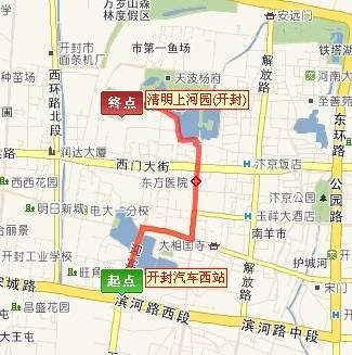 路线:从开封西站出发乘坐1路下行(火车站-铁路公园),抵达清明上河园,步行至终点。