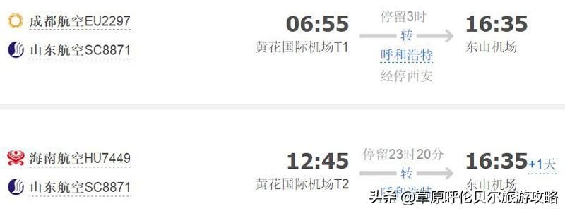 关于飞机,长沙到海拉尔没有直达的航班,可以到呼和浩特或者北京进行转机,最快的在当天就可以到达,具体航班可以参考下图:
