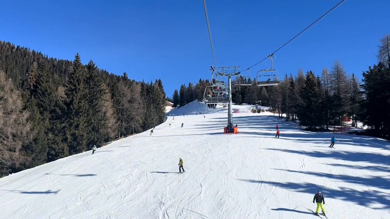 给你们看一下,这里都是玩双板的,基本上都是双板的,人也是挺少的。雪道特别大,我不知道这边人少多,主要是因为这边的住宿太贵,还是什么原因,反正很有可能。不过目前的雪票,这边是可以买一个整个多洛米蒂的山脉的雪票的,它是一个75欧一天,算成人民币大概550左右。