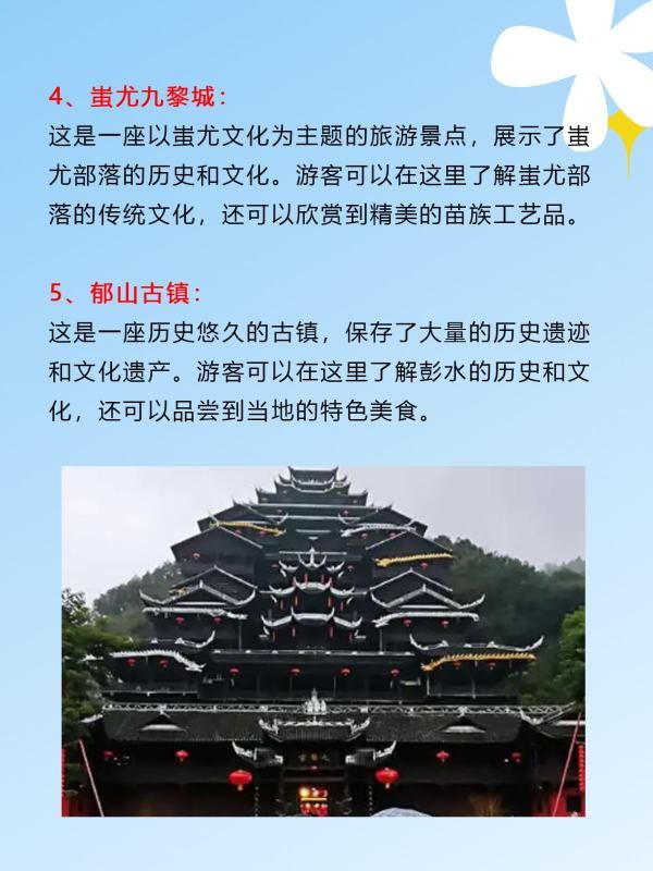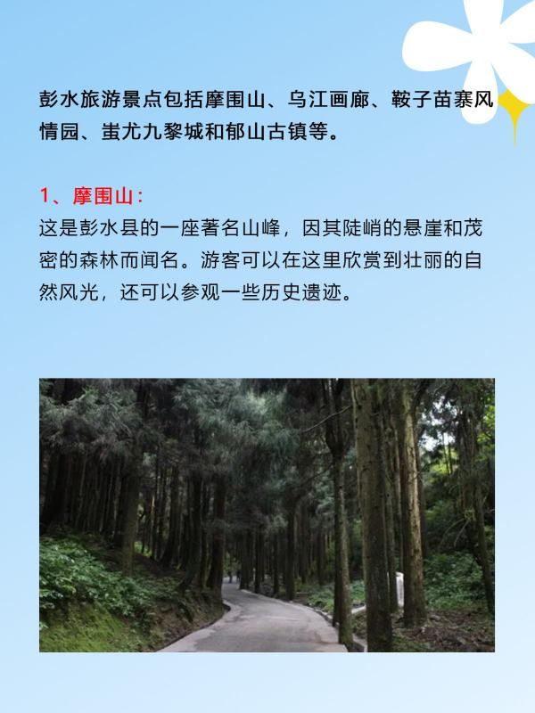 彭水旅游景点包括摩围山、乌江画廊、鞍子苗寨风情园、蚩尤九黎城和郁山古镇等。
