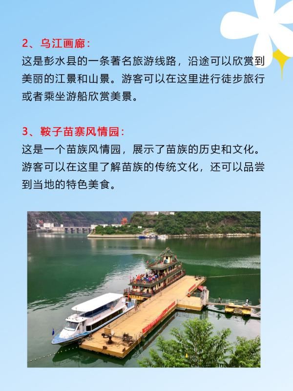 乌江画廊:乌江流经彭水县,沿江两岸风景如画,有“乌江画廊”之称。可以乘坐游船,欣赏两岸的奇山异石和田园风光,体验宁静而美丽的江上旅行。