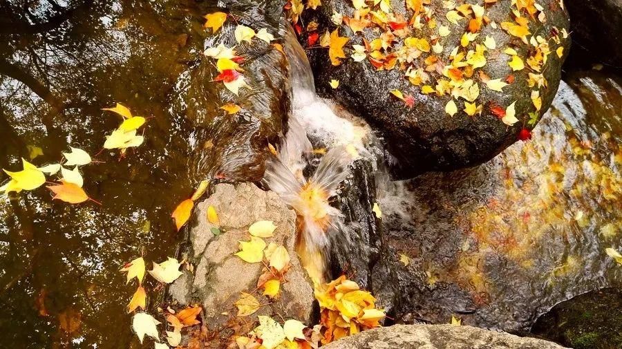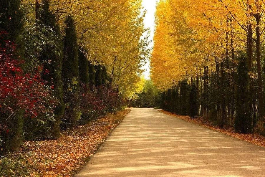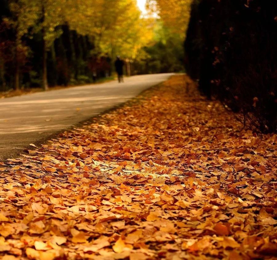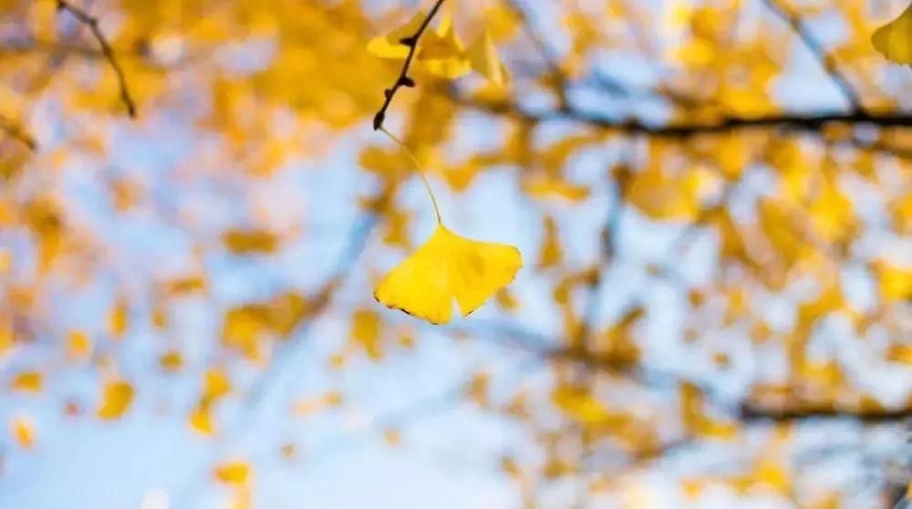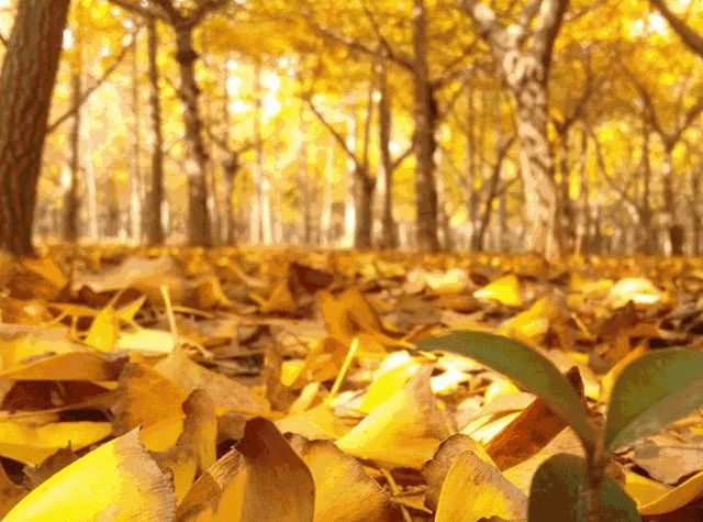 地上一片片黄叶,阳光映射下来,仿佛时光静止,秋风起,片片飞舞,美得如痴如醉。
